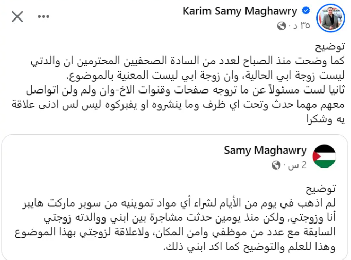 ولتوضيح اللبس الذي نشأ حول الحادثة، بعد اعتقاد روّاد مواقع التواصل الاجتماعي أنّ زوجة الفنان سامي مغاوري والد كريم هي التي تعرّضت للاعتداء من قِبل إدارة المول قام سامي ، والد الفنان كريم، بنشر تدوينة على صفحته الشخصية على موقع التواصل الاجتماعي فيسبوك، نفى فيها أنّه وزوجته قد زارا أي متجر لشراء مواد تموينية، مشيراً إلى حدوث مشاجرة بين ابنه وزوجته السابقة مع عدد من موظفي وأمن المكان.
