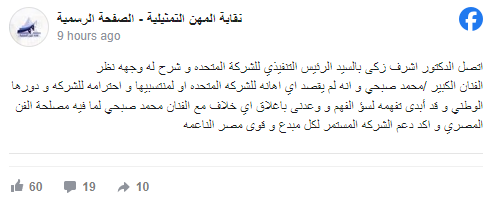 ولتوضيح ما حدث أصدرت نقابة المهن التمثيلية بياناً عاجلاً بشأن الأزمة القائمة بين الفنان محمد صبحي والشركة المتحدة للخدمات الإعلامية، جاء فيه أن نقيب المهن التمثيلية، أشرف زكي، اتصل بالرئيس التنفيذي للشركة المتحدة “وشرح له وجهة نظر الفنان الكبير محمد صبحي، وأنه لم يقصد أية إهانة للشركة المتحدة أو لمنتسبيها، واحترامه للشركة ودورها الوطني.. وقد أبدى تفهمه لسوء الفهم”.