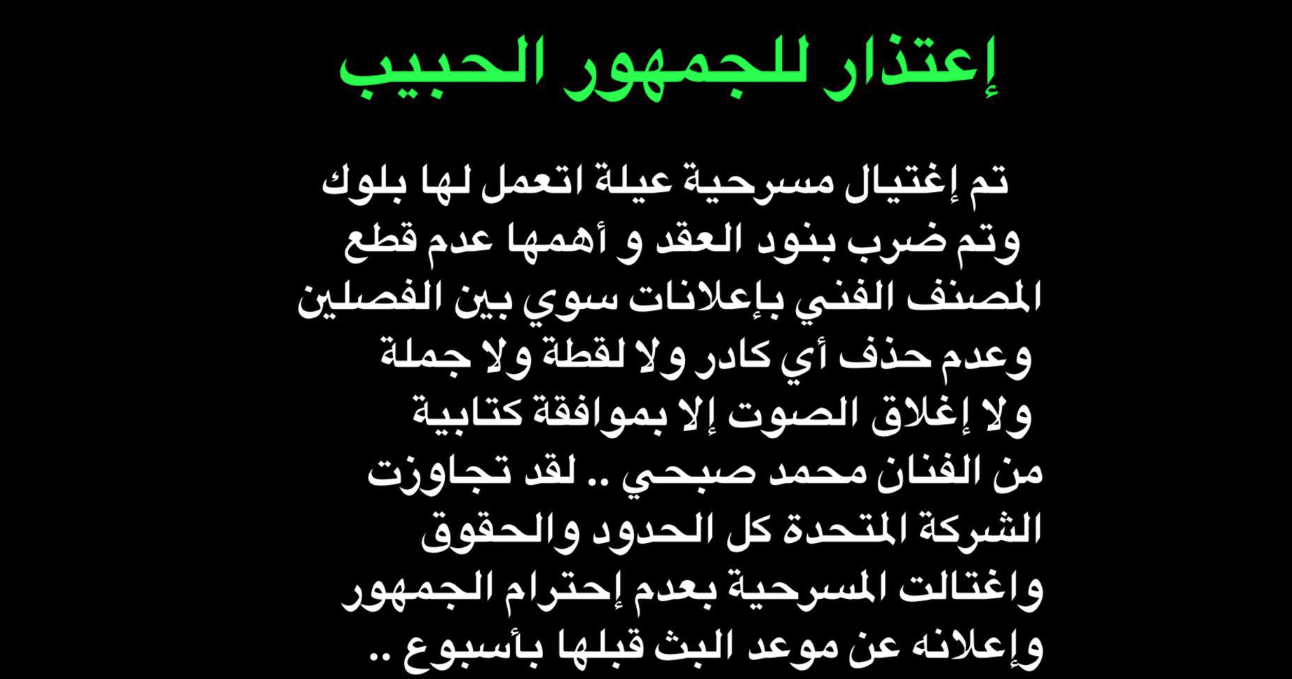 وأكدت الشركة أن صبحي “من قام بمخالفة الاتفاق والتعاقد المبرم مع الشركة.. بتغيير كبير مفاجئ، في نص مسرحيته الأخيرة؛ دون موافقة الشركة وبالمخالفة للعقد، حتى وصل الأمر أن تضمنت المسرحية إيحاءات وألفاظ لا تقبلها القواعد والأكواد الأخلاقية الإعلامية، ولا مواثيق الشرف المهني”.