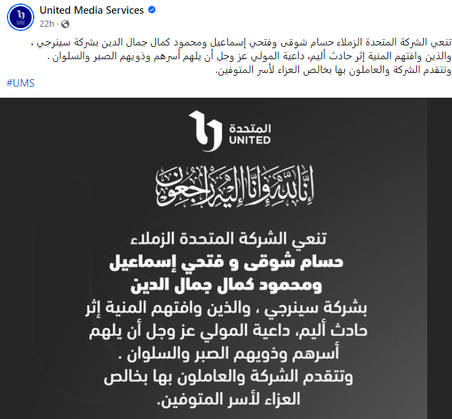 ونعت الشركة المتحدة للخدمات الإعلامية المنتجين المصريين العاملين بشركة سينرجي، كما نعتهم نقابة المهن السينمائية في بيان لها عبر حسابها الرسمي على فيسبوك، حيث كتبت: “ينعى نقيب السينمائيين والسادة أعضاء مجلس إدارة نقابة المهن السينمائية الزملاء المنتجين حسام شوقي، محمود كمال، فتحي إسماعيل، الذين وافتهم المنية في حادث سير، نشاطركم الأحزان في وفاة المغفور لهم بإذن الله، وبكل الحزن والأسى ندعو لهم بالرحمة والمغفرة ولأسرهم والأسرة الفنية بالصبر والسلوان، تغمدهم الله بواسع رحمته”.