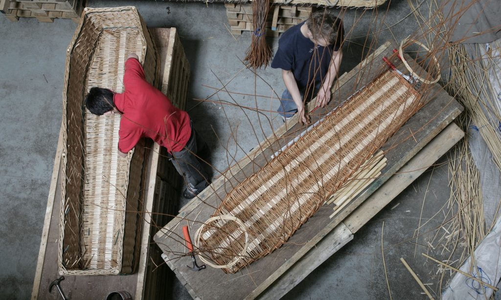 في معرض مزدحم لدور الجنازات، تم تنظيمه مؤخراً في كنيسةٍ بمدينة أمستردام، أدرج العارضون نعشاً مِن قِطعٍ منفصلة تركِّبه وتزيِّنه