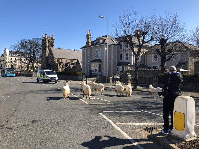 نشر موقع ABC الأمريكي، الأربعاء 1 أبريل/ نيسان 2020، مقاطع فيديو لقطيع من الماعز البري في شوارع لاندودنو بويلز البريطانية، بعد أن أصبحت مهجورة بسبب الحجر الصحي الذي فرض على المواطنين بسبب فيروس كورونا.