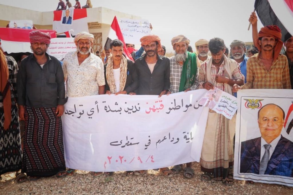 نظم عشرات اليمنيين، الجمعة 4 سبتمبر/أيلول 2020، وقفة احتجاجية بمحافظة أرخبيل سقطرى، رفضاً لأي وجود إسرائيلي في الجزيرة التي تحتل