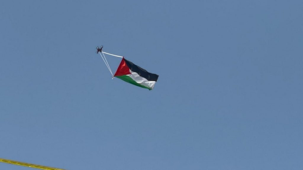 حلق العلم الفلسطيني فوق رؤوس المستوطنين وقوات الاحتلال عبر طائرة مسيرة في سماء باب العامود تزامناً مع “مسيرة الأعلام” الإسرائيلية