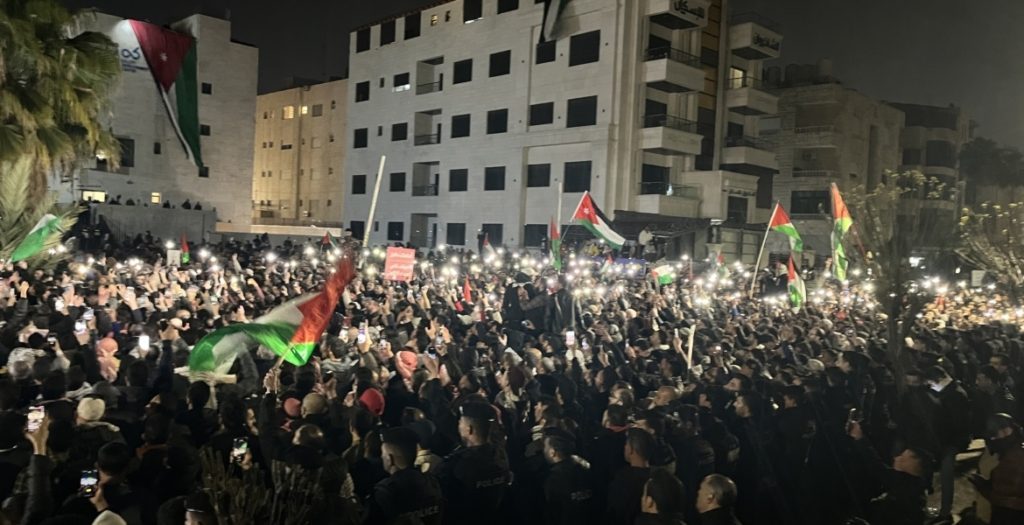 واصل آلاف الأردنيين، مساء الجمعة 29 مارس/آذار 2024، تظاهراتهم لليوم السادس على التوالي في الشوارع المحيطة بسفارة الاحتلال الإسرائيلي في