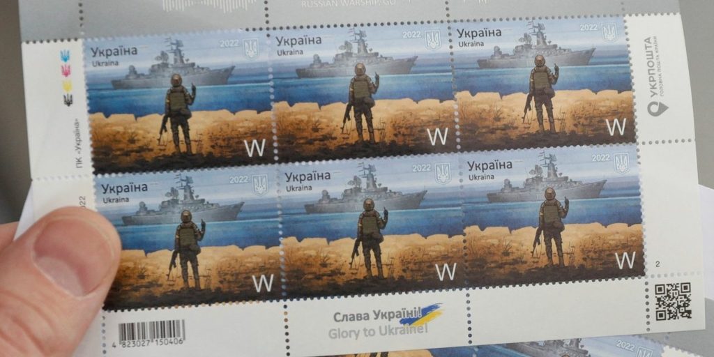 لقي طابع بريدي أطلقته أوكرانيا مؤخراً يُظهر جندياً أوكرانيّاً وهو يومئ بحركة غير لائقة عبر يده بوجه السفينة الحربية الروسية