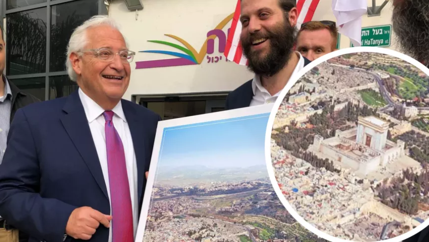 التُقطت صورة لديفيد فريدمان -السفير الأميركي لدى إسرائيل- أمس الثلاثاء 22 مايو/أيار 2018، وهو يتلقَّى صورة جوية للقدس تحاكي الهيكل