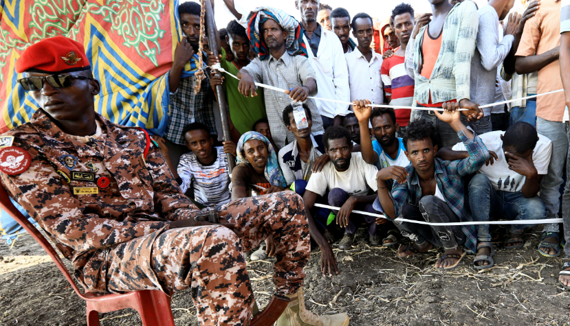 اجتمع عدد كبير من الإثيوبيين، فرّوا من النزاع في منطقة تيغراي، أمام مدرسة حُولت إلى مرفق للمساعدة الإنسانية، ومركز إيواء