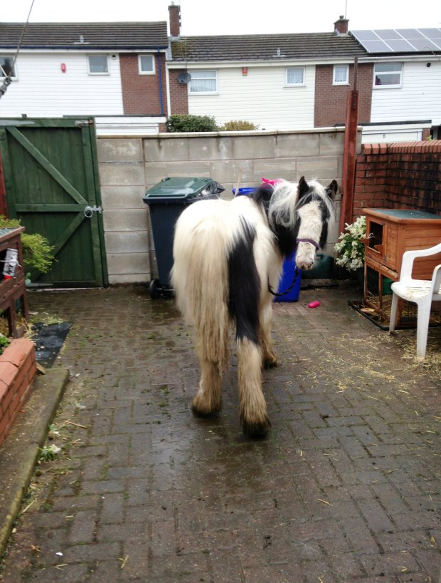 أصيبت سيدة مسنة في بريطانيا بالذهول حينما خرجت إلى حديقة منزلها ووجدت حصاناً يقف داخلها لا تعرف من أين جاء أمن مالكه.