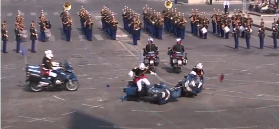 تصادم رجلا شرطة في أثناء استعراض عسكري نُظِّم بمناسبة العيد الوطني، بحضور الرئيس إيمانويل ماكرون وضيوف دعاهم لهذه المناسبة السبت