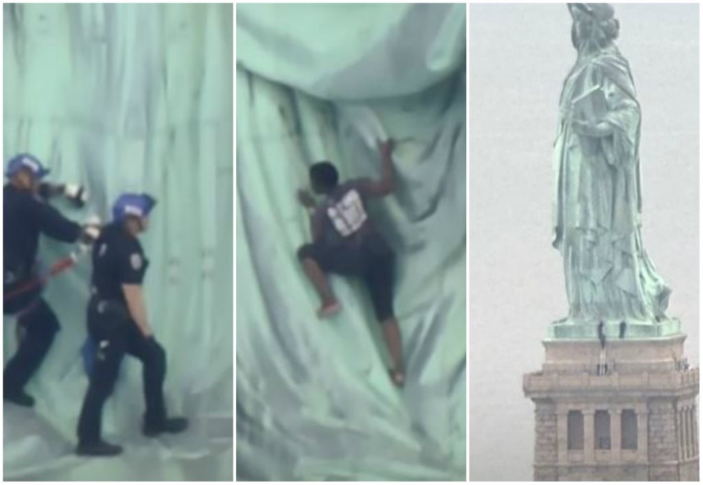 أنزلت الشرطة امرأة من على قاعدة تمثال الحرية الحجرية، الأربعاء، بعد أزمة استمرت ثلاث ساعات، وفرضت إخلاء المَعْلَم الشهير في