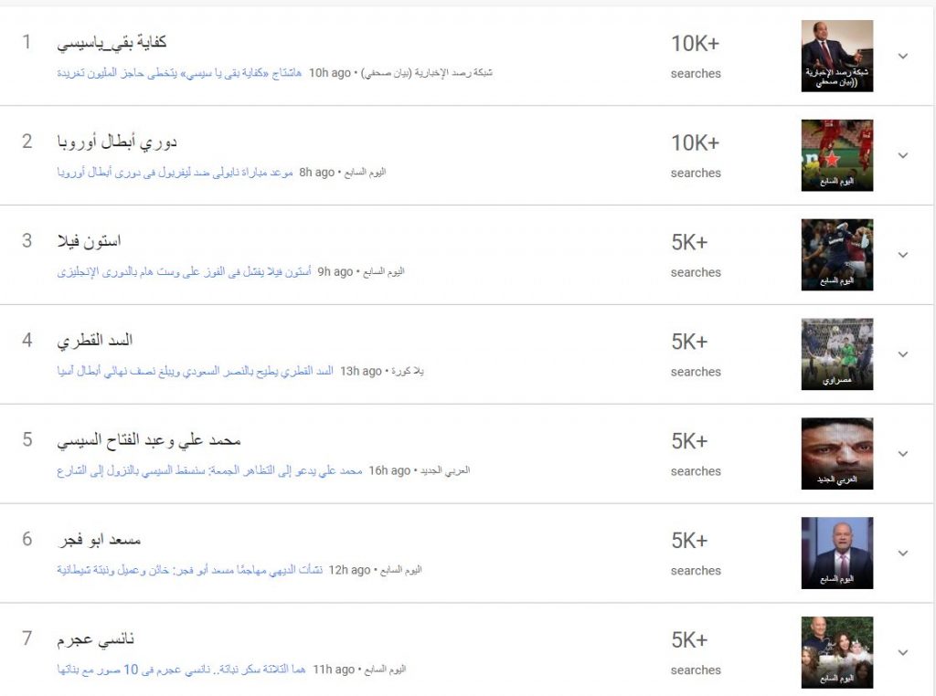 أما على موقع جوجل كانت تصدرت كلمات “القبض على محمد علي – كفاية بقى ياسيسي – محمد علي وعبدالفتاح السيسي – مسعد أبو فجر – كمال خليل – محمود السيسي” عمليات البحث في مصر.
