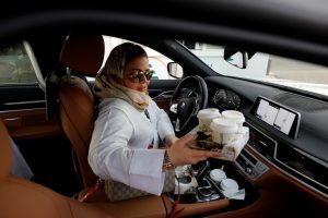 سعوديات قيادة السيارة Leave a Comment / By يمان زيتوني / يونيو 24, 2018 سميرة الغامدي ، أخصائية نفسية، تحصل على القهوة أثناء قيادة سيارتها للعمل، في جدة