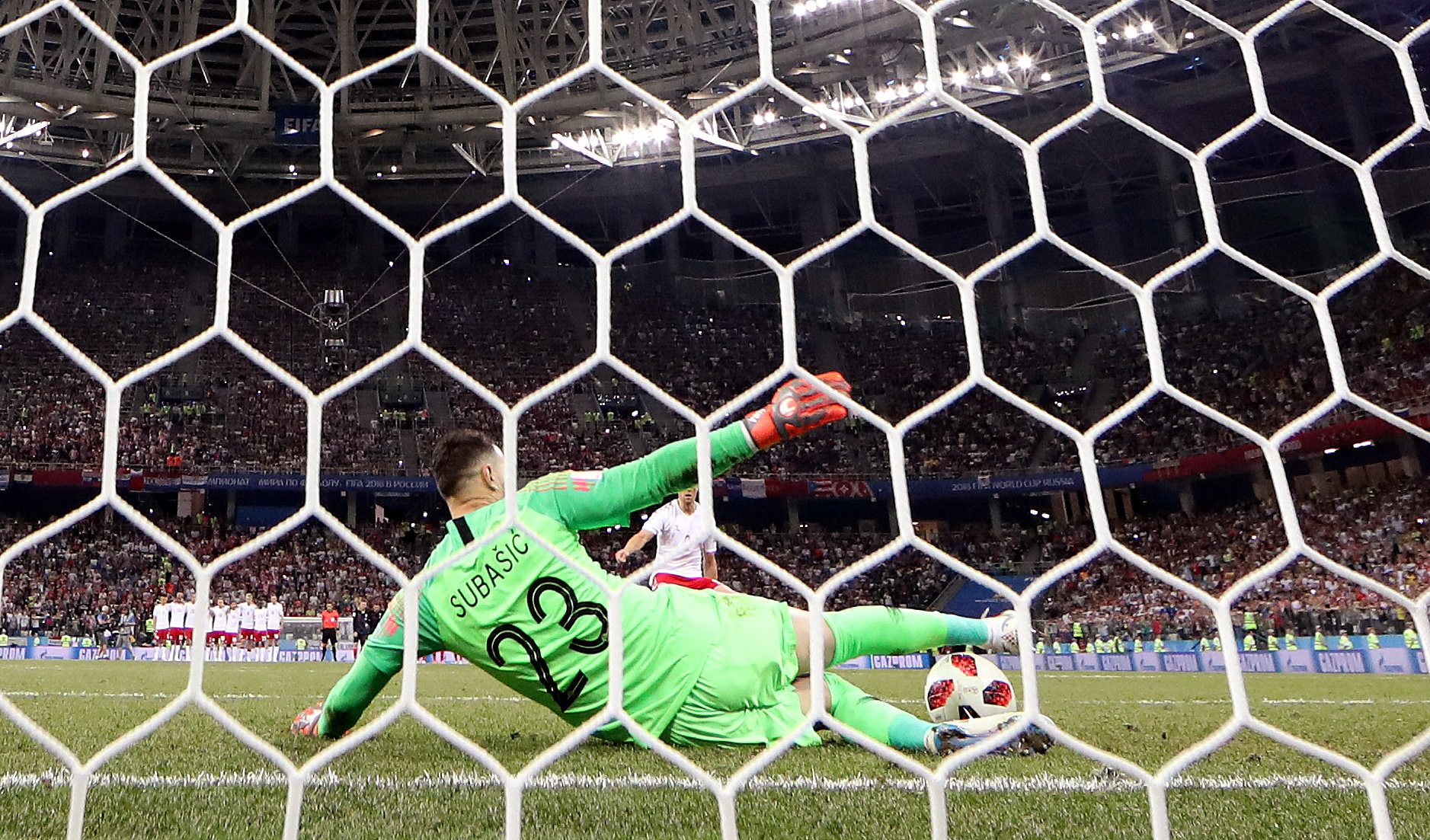 وعلى الرغم من ذلك، كان هناك خرق واضح للقانون في تنفيذ ركلات الجزاء في ملعب مدينة نيجني نوفغورود. ويتضح هذا الخرق من خلال تصدي كاسبر شمايكل المثير للجدل لضربة الجزاء التي نفذها الكرواتي، لوكا مودريتش، في الدقائق الأخيرة من الوقت الإضافي. فقد ارتمى الحارس الدنماركي بجسده باتجاه الزاوية اليسرى السفلى للمرمى، ليمسك بالكرة، إلا أن الإعادة أظهرت أن شمايكل لم يكن واقفاً على خط المرمى.