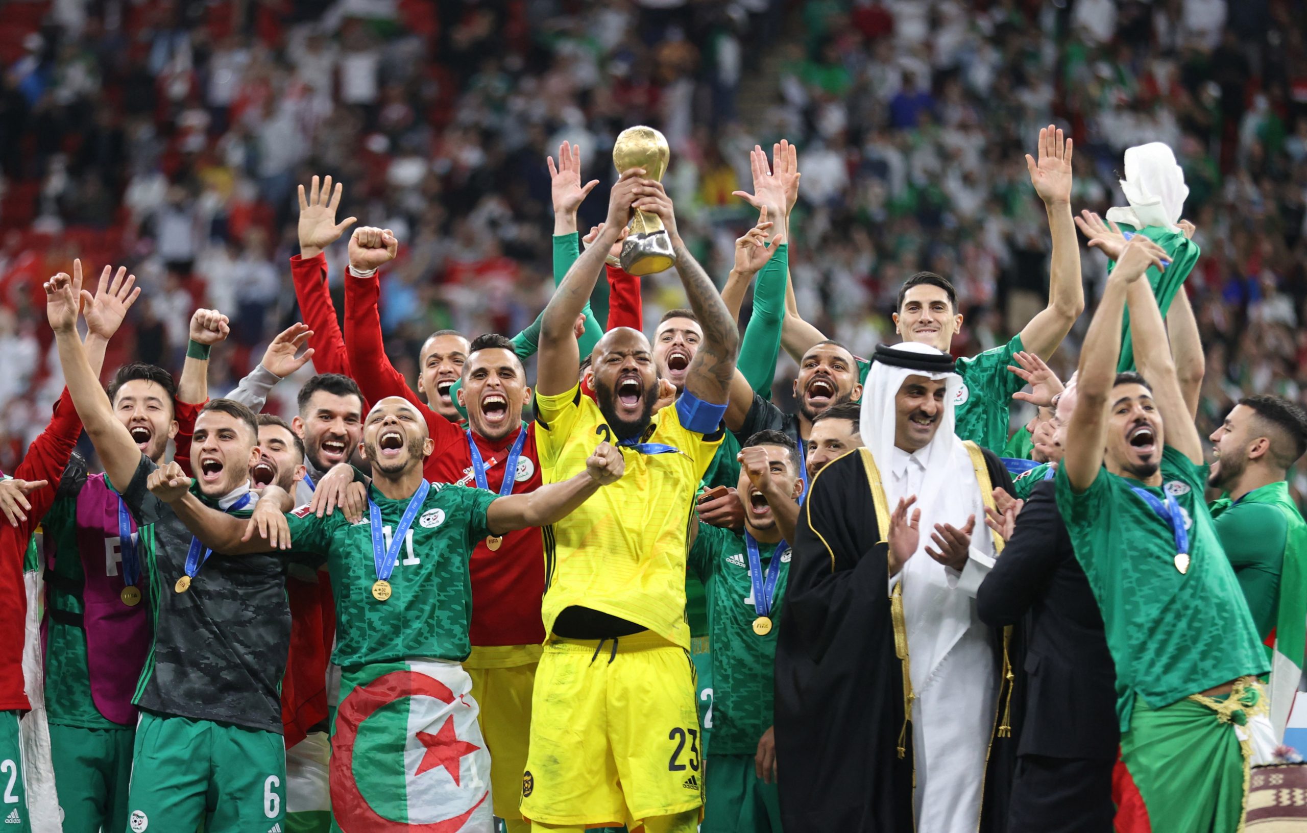 تُوِّج منتخب الجزائر بلقب كأس العرب لكرة القدم لأول مرة في تاريخه، بعد الفوز 2-صفر على تونس عقب وقت إضافي، في قمة مغاربية مثيرة وعنيفة أمام أكثر من 60 ألف متفرج باستاد البيت في الخور مساء السبت 18 ديسمبر/كانون الأول 2021.