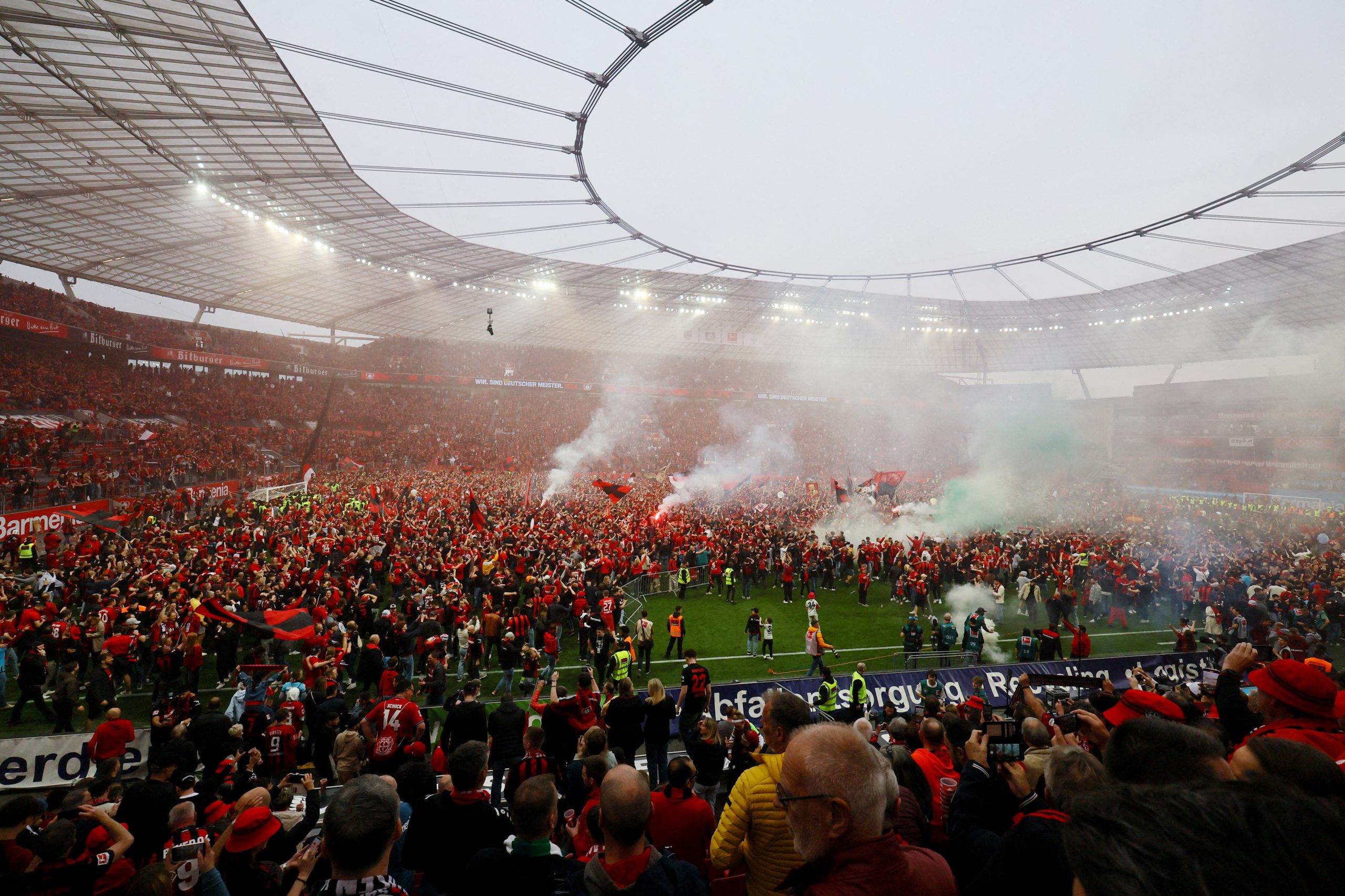 جماهير النادي المنتمي إلى ولاية شمال الراين، اجتاحت أرضية الملعب بعد نهاية المباراة، ليس للاحتفال ببطولة الدوري وحسب، بل أيضاً لأنه أول لقب دوري للنادي الذي يعود تاريخ تأسيسه لأكثر من 120 عاماً.