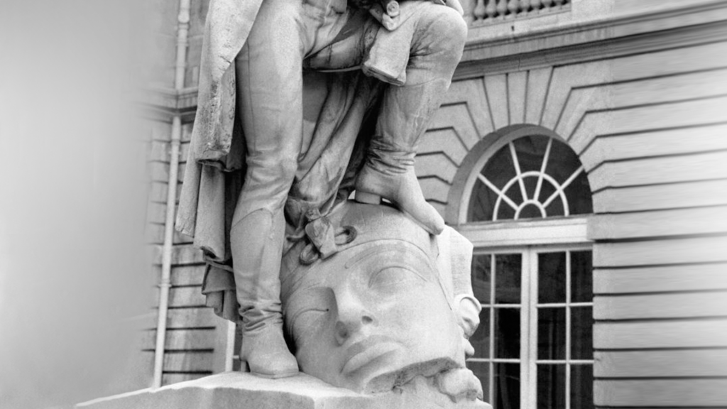 عالم آثار أوروبي مشهور يدعس بقدمه رأس فرعون مصري. بهذا المشهد الاستفزازي تزين إحدى المدن الفرنسية ساحاتها الأشهر بتمثال فني