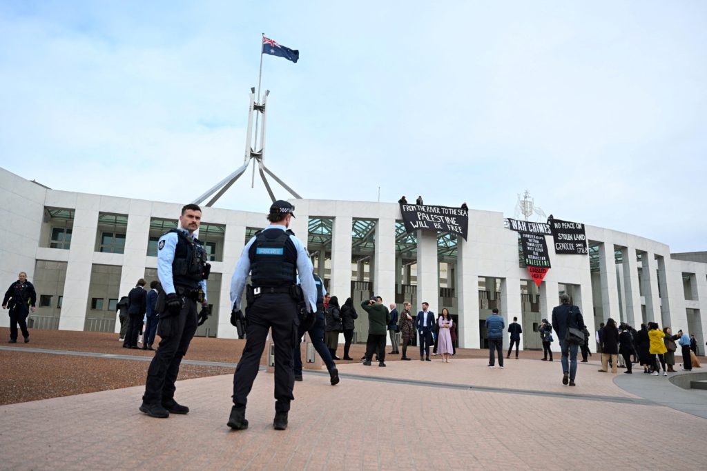 صعد محتجون داعمون لغزة إلى سطح مبنى البرلمان الأسترالي في كانبيرا الخميس 4 يوليو/تموز 2024 ورفعوا لافتات مؤيدة للفلسطينيين واتهموا