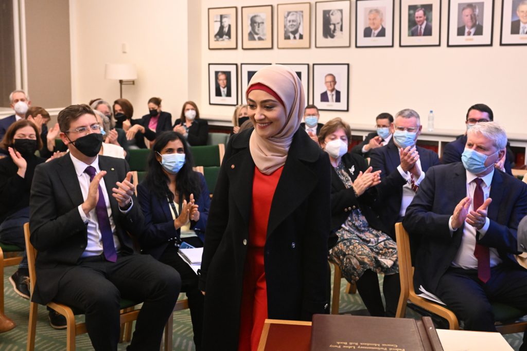 ألقت النائبة الأسترالية المسلمة فاطمة بايمان خطابها الأول أمام أعضاء مجلس الشيوخ، الثلاثاء 26 يوليو/تموز 2022، لتكون أول امرأة محجبة