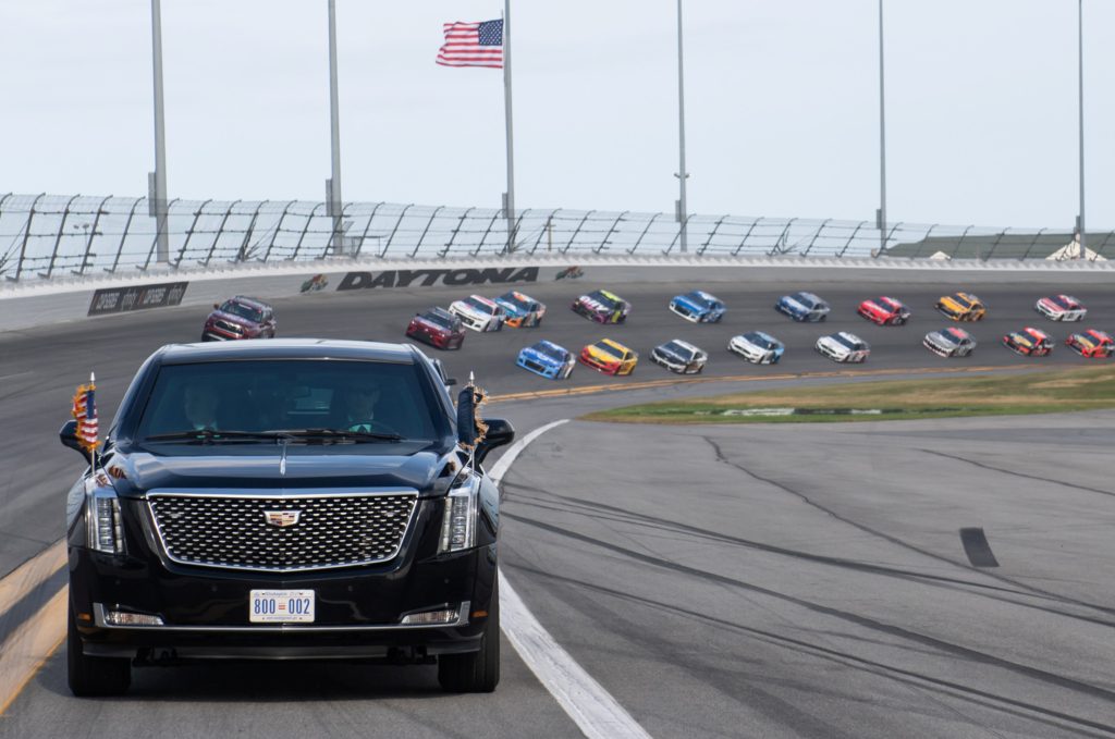 دخل الرئيس الأمريكي دونالد ترامب، الأحد 16 فبراير/شباط 2020، سباق دايتونا 500 الشهير للسيارات بشكل استعراضي في سيارته الليموزين على مضمار السباق بعد تحليقه بطائرته الرئاسية فوق الحشد.