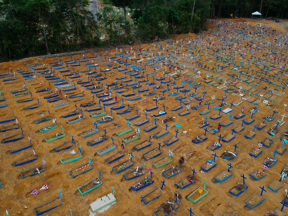 نقل موقع Business Insider الأمريكي مشاهد الصلبان الكثيفة ذات الألوان الزرقاء والتركوازية والبيضاء، التي تنتشر بجوار المقابر الجماعية في مدينة ماناوس البرازيلية، والتي كشفت عن مأساة ارتفاع أعداد الوفيات التي تسبَّب فيها فيروس كورونا المستجد في البلاد، بعدما أصبحت البرازيل تحتل حالياً المركز الثاني بعد الولايات المتحدة مباشرة في أعداد حالات الإصابة بمرض كوفيد-19 حول العالم.