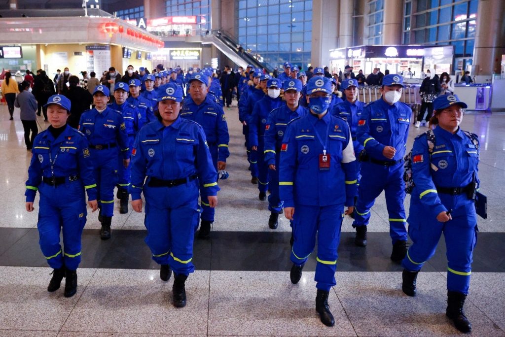 أظهرت لقطات فيديو رجال شرطة صينيين يتشحون بالسواد، ويتدربون على مناورةٍ لتطويق شخصٍ واحد يرفع ورقةً بيضاء، التي أصبحت رمزاً