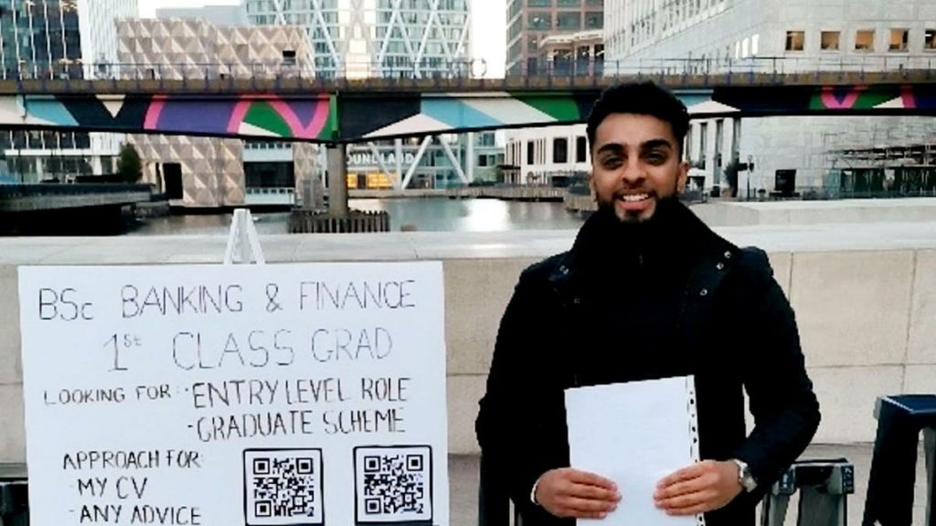 لجأ شاب يبحث عن عمل إلى عرض مواهبه وشخصيته بطريقة أكثر جرأة وإبداعاً، حيث نصب لوحة عرض متنقلة أمام محطة