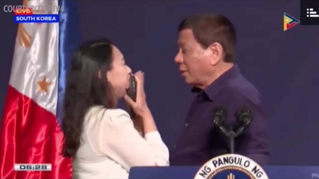 أثار الرئيس الفلبّيني رودريغو دوتيرتي حالةً من الغضب بعدما قام بتقبيل مواطنة فلبّينية تعمل بالخارج على شفتيها خلال فعالية عامّة
