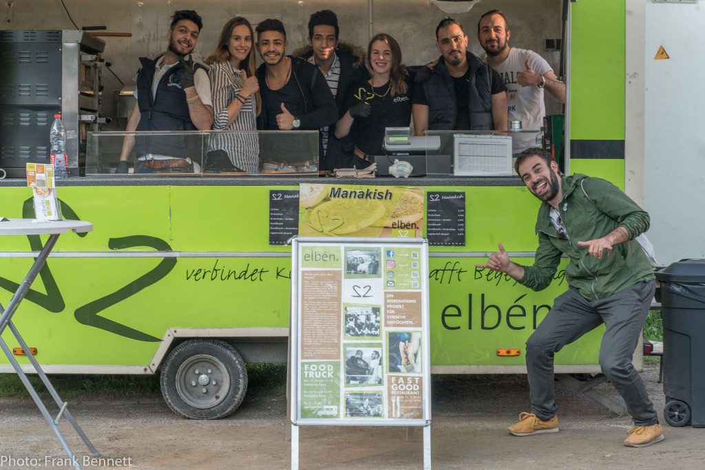 مجموعة من الشبان والشابات ينثرون الزعتر وخلطات أخرى على أقراص عجين رقيقة، يضعونها في الفرن ثم يخرجونها بعد أن تنضج، ليستمتع الألمان بأكل “المناقيش” وهي ساخنة
