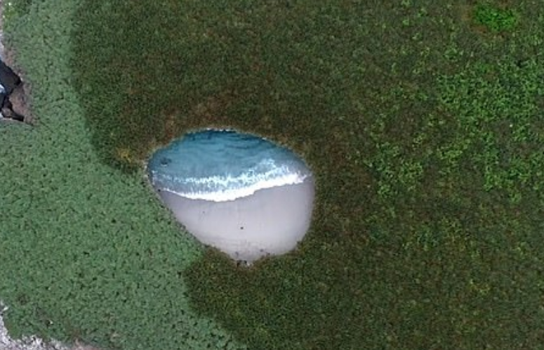 التقط تارسيسيو سواريز، وهو مصورٌ مكسيكي، صوراً جوية مدهشة لشاطئ يختفي داخل فوهة انفجار قنبلة على جزيرةٍ في ساحلٍ مكسيكي،