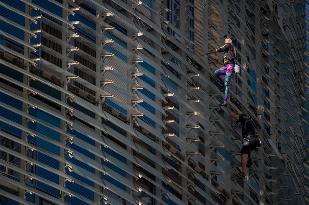 تسلق المغامر المعروف باسم “الرجل العنكبوت الفرنسي”، ألان روبير، واحدة من أعلى ناطحات السحاب في برشلونة، السبت، 1 أكتوبر/تشرين الأول،