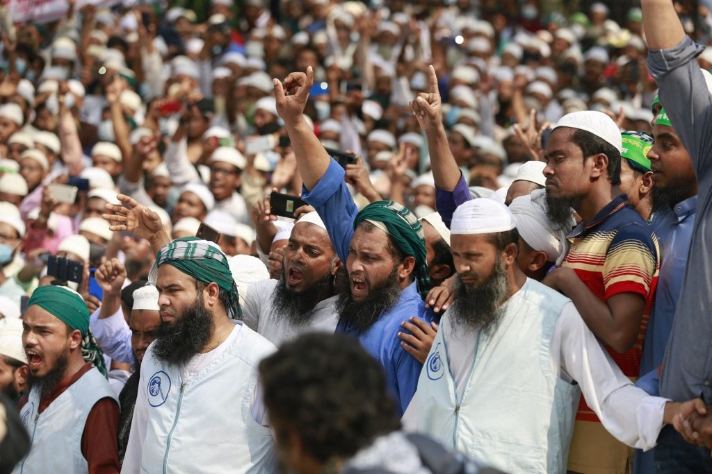 تظاهر عشرات آلاف الأشخاص الثلاثاء 27 أكتوبر/تشرين الأول 2020 في دكا ضد فرنسا داعين إلى مقاطعة المنتجات الفرنسية وأحرقوا دمية