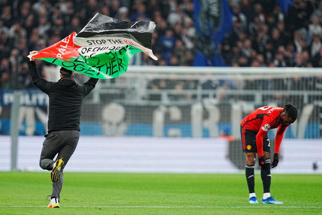 رافعاً علم فلسطين، اقتحم مشجع أرضية ملعب “باركن ستاديون”، معقل فريق كوبنهاغن الدنماركي، خلال مباراة الأخير ضد مانشستر يونايتد، في