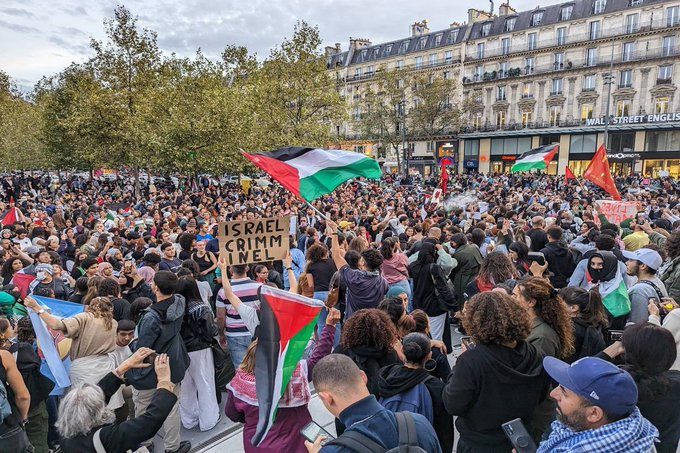 شهدت العاصمة الفرنسية باريس، الخميس 19 أكتوبر/تشرين الأول 2923، مظاهرة حاشدة تضامناً مع الشعب الفلسطيني ورفضاً للقصف الإسرائيلي المستمر على