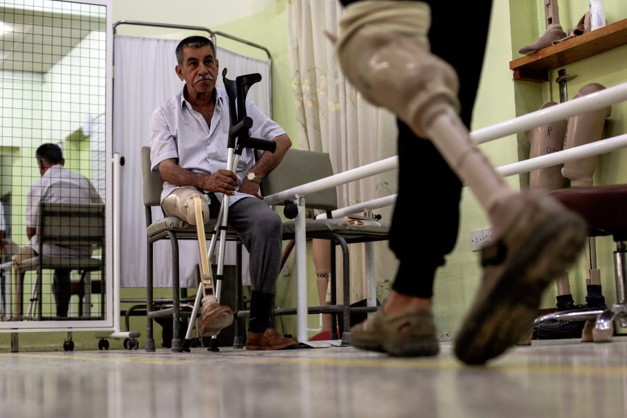 يبدو التركيز محفوراً على وجه حسين، بينما يسير بجوار خط أصفر منقوش على أرضية غرفة العلاج الطبيعي التابعة للعيادة. إذ