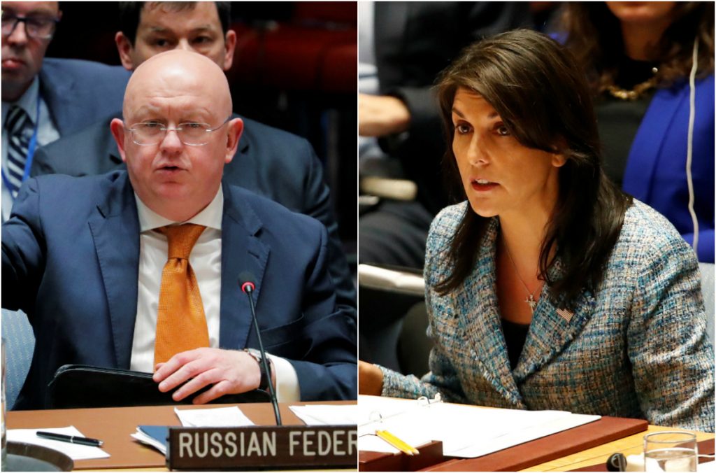 شهد مجلس الأمن، الجمعة 13 أبريل/نيسان 2018، تراشقاً بين المندوب الروسي فاسيلي نيبينزيا، ونظرائه الغربيين، وخصوصاً الأميركية نيكي هيلي. حيث